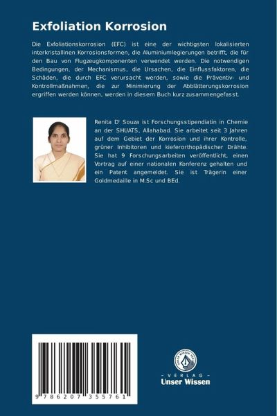 Die Exfoliationskorrosion (EFC) ist eine der wichtigsten lokalisierten interkristallinen Korrosionsformen, die Aluminiumlegierungen betrifft, die für den Bau von Flugzeugkomponenten verwendet werden. Die notwendigen Bedingungen, der Mechanismus, die Ursachen, die Einflussfaktoren, die Schäden, die durch EFC verursacht werden, sowie die Präventiv- und Kontrollmaßnahmen, die zur Minimierung der Abblätterungskorrosion ergriffen werden können, werden in diesem Buch kurz zusammengefasst.