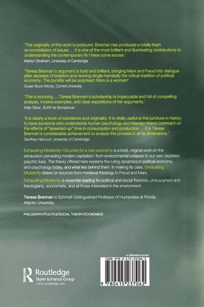 "Exhausting Modernity" is a bold and exciting new work on the exhaustion of our resources, both natural and human. Brennan marshalls the insights of Marx and Freud to provide a compelling analysis of the pervading modern capitalism: environmental collapse, rising poverty levels, and the increased global economic disparity. Linking the consumption of environmental resources to our own depleted psychic life, she shows that modernity must be rethought if we are to find a sustainable future for both the environment and our own psychic life.