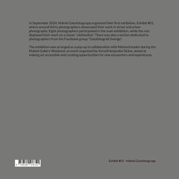 In September 2024, Malmö Gatufotogrupp organized their first exhibition, Exhibit #01, where around thirty photographers showcased their work in street and urban photography. Eight photographers participated in the main exhibition, while the rest displayed their work on a classic "clothesline". There was also a section dedicated to photographers from the Facebook group "Gatufotografi Sverige". The exhibition was arranged as a pop-up in collaboration with Matverkstaden during the Malmö Gallery Weekend, an event organized by Konstfrämjandet Skåne, aimed at making art accessible and creating opportunities for new encounters and experiences.
