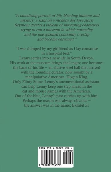 "A tantalising portrait of life, blending humour and mystery; a slant on a modern day love story, Seymour creates a tableau of interesting characters trying to run a museum in which normality and the unexplained constantly overlap and become entwined." "I was dumped by my girlfriend as I lay comatose in a hospital bed." Lenny settles into a new life in South Devon. His work at the museum brings challenges; one becomes the bane of his life ~ an elusive steel ball that arrived with the founding curator, now sought by a manipulative American, Hogan King. Only Flinty Stone, Lenny's unconventional assistant, can help Lenny keep one step ahead in the cat and mouse games with the American. Out of the blue, Lenny's past catches up with him. Perhaps the reason was always obvious ~ the answer was in the name: Exhibit 51