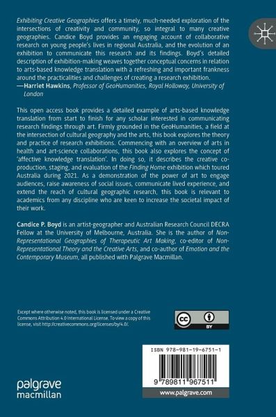 This open access book provides a detailed example of arts-based knowledge translation from start to finish for any scholar interested in communicating research findings through art. Firmly grounded in the GeoHumanities, a field at the intersection of cultural geography and the arts, this book explores the theory and practice of research exhibitions. Commencing with an overview of arts in health and art-science collaborations, this book also explores the concept of 'affective knowledge translation'. In doing so, it describes the creative co-production, staging, and evaluation of the Finding Home exhibition which toured Australia during 2021. As a demonstration of the power of art to engage audiences, raise awareness of social issues, communicate lived experience, and extend the reach of cultural geographic research, this book is relevant to academics from any discipline who are keen to increase the societal impact of their work.