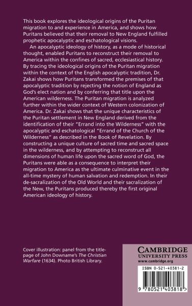 This book explores the ideological origins of the Puritan migration to and experience in America, and shows how Puritans believed that their removal to New England fulfilled prophetic apocalyptic and eschatological visions. An apocalyptic ideology of history, as a mode of historical thought, enabled Puritans to reconstruct their removal to America within the confines of sacred, ecclesiastical history. By tracing the ideological origins of the Puritan migration within the context of the English apocalyptic tradition, Dr Zakai shows how Puritans transformed the premises of that tradition by rejecting the notion of England as God's elect nation and by conferring that title upon the American wilderness. The Puritan migration is analyzed further within the wider context of Western colonization of America. Dr Zakai shows that the unique characteristics of the Puritan settlement in New England derived from identification with the 'Errand of the Church of the Wilderness' as described in the Book of Revelation.