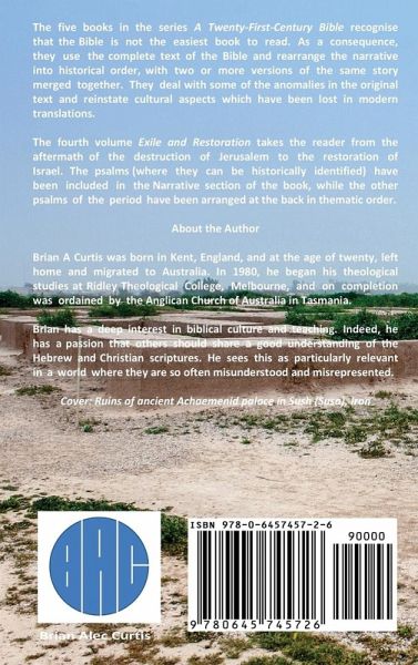 The five books in the series A Twenty-First-Century Bible recognise that the Bible is not the easiest book to read. As a consequence, they use the complete text of the Bible and rearrange the narrative into historical order, with two or more versions of the same story merged together. They deal with some of the anomalies in the original text and reinstate cultural aspects which have been lost in modern translations. The text is presented in two types: a translation of the original languages in normal print; and additions-to help the flow of the narrative and to enlighten the reader to some of the cultural background and meaning-in italics. The fourth volume Exile and Restoration takes the reader from the aftermath of the destruction of Jerusalem to the restoration of Israel. The psalms (where they can be historically identified) have been included in the Narrative section of the book, while the other psalms of the period have been arranged at the back in thematic order.