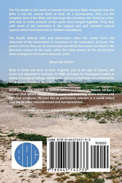 The five books in the series A Twenty-First-Century Bible recognise that the Bible is not the easiest book to read. As a consequence, they use the complete text of the Bible and rearrange the narrative into historical order, with two or more versions of the same story merged together. They deal with some of the anomalies in the original text and reinstate cultural aspects which have been lost in modern translations. The text is presented in two types: a translation of the original languages in normal print; and additions-to help the flow of the narrative and to enlighten the reader to some of the cultural background and meaning-in italics. The fourth volume Exile and Restoration takes the reader from the aftermath of the destruction of Jerusalem to the restoration of Israel. The psalms (where they can be historically identified) have been included in the Narrative section of the book, while the other psalms of the period have been arranged at the back in thematic order.