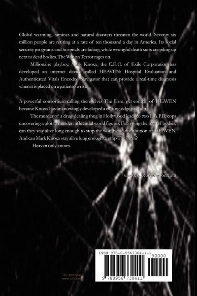 Global warming, famines and natural disasters threaten the world. Seventy six million people are retiring at a rate of ten thousand a day in America. Its social security programs and hospitals are failing, while wrongful death suits are piling up next to dead bodies. The War on Terror rages on. Millionaire playboy, Mark Knoxx, the C.E.O. of Exile Corporation has developed an internet device called HEAVEN: Hospital Evaluation and Authenticated Vitals Encoded Navigator that can provide a real-time diagnosis when it is placed on a patients' wrist. A powerful consortium calling themselves The Firm, get control of HEAVEN because Knoxx has unknowingly developed a cutting-edge weapon. The murder of a drug-dealing thug in Hollywood leads to two L.A.P.D. cops uncovering a plot to murder influential world figures. Following the trail of bodies, can they stay alive long enough to stop the worldwide distribution of HEAVEN. And can Mark Knoxx stay alive long enough to stop The Firm? Heaven only knows.