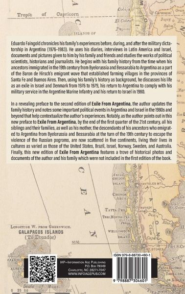 Eduardo Faingold chronicles his family's experiences before, during, and after the military dictatorship in Argentina (1976-1983). He uses his diaries, interviews in Latin America and Israel, documents and pictures given to him by his family and friends and studies the works of political scientists, historians and journalists. He begins with his family history from the time when his ancestors immigrated in the 19th century from Byelorussia and Bessarabia to Argentina as a part of the Baron de Hirsch's emigrant wave that established farming villages in the provinces of Santa Fé and Buenos Aires. Then, using his family's history as background, he discusses his life as an exile in Israel and Denmark from 1976 to 1979, his return to Argentina to comply with his military service in the Argentine Marine Infantry and his return to Israel in 1980.In a revealing preface to the second edition of Exile from Argentina, the author updates the family history and notes some important political events in Argentina and Israel in the 1980s and beyond that help contextualize the author's experiences. Notably, as the author points out in this new preface to Exile from Argentina, by the end of the first quarter of the 21st century, all his siblings and their families, as well as his mother, the descendants of his ancestors who emigrated to Argentina from Byelorussia and Bessarabia at the turn of the 19th century to escape the violence of the Russian pogroms, are now scattered in five continents, living their lives in cultures as varied as those of the United States, Brazil, Israel, Norway, Sweden, and Australia. Finally, this new edition of Exile from Argentina features a trove of historical photos and documents of the author and his family which were not included in the first edition of the book.