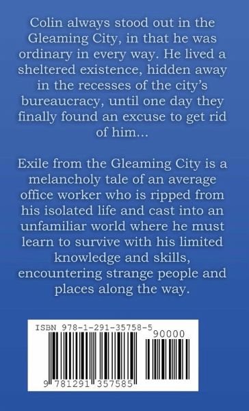 Colin always stood out in the Gleaming City, in that he was ordinary in every way. He lived a sheltered existence, hidden away in the recesses of the city's bureaucracy, until one day they finally found an excuse to get rid of him... Exile from the Gleaming City is a melancholy tale of an average office worker who is ripped from his isolated life and cast into an unfamiliar world where he must learn to survive with his limited knowledge and skills, encountering strange people and places along the way. About the Author: Tegan Wilson hails from suburban Cheshire, United Kingdom, and writes fantastical tales to escape the incredible tedium that is life in backwater England. His main influences are from fantasy and science fiction works of the '80s and '90s, as well as observations of life in modernity. When he's not writing, he is engrossed in video games or creating what he likes to call music.