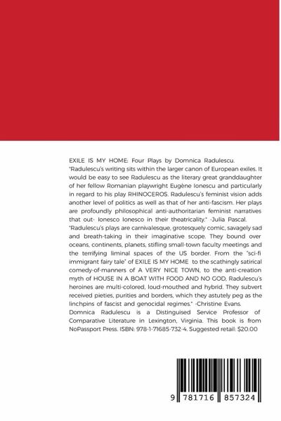 EXILE IS MY HOME: Four Plays by Domnica Radulescu. Scholar Christine Evans says 'Radulescu's plays are carnivalesque, grotesquely comic, savagely sad and breath-taking in their imaginative scope. They bound over oceans, continents, planets, stifling small-town faculty meetings and the terrifying liminal spaces of the US border.' Domnica Radulescu is a Distinguished Service Professor of Comparative Literature in Lexington, VA. This is a NoPassport Press publication.