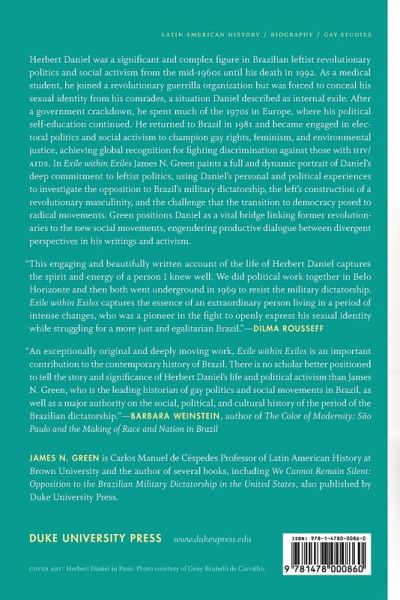 Herbert Daniel was a significant and complex figure in Brazilian leftist revolutionary politics and social activism from the mid-1960s until his death in 1992. As a medical student, he joined a revolutionary guerrilla organization but was forced to conceal his sexual identity from his comrades, a situation Daniel described as internal exile. After a government crackdown, he spent much of the 1970s in Europe, where his political self-education continued. He returned to Brazil in 1981, becoming engaged in electoral politics and social activism to champion gay rights, feminism, and environmental justice, achieving global recognition for fighting discrimination against those with HIV/AIDS. In Exile within Exiles, James N. Green paints a full and dynamic portrait of Daniel's deep commitment to leftist politics, using Daniel's personal and political experiences to investigate the opposition to Brazil's military dictatorship, the left's construction of a revolutionary masculinity, and the challenge that the transition to democracy posed to radical movements. Green positions Daniel as a vital bridge linking former revolutionaries to the new social movements, engendering productive dialogue between divergent perspectives in his writings and activism.