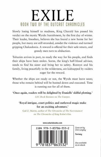 Slowly losing himself to madness, King Charald has passed his verdict on the mystic Wyrds: banishment, by the first day of winter. Their leader, Imoshen, believes she has found a new home for her people, but many are still stranded, amidst the violence and turmoil gripping Chalcedonia. A reward is offered for their safe return, and greedy men turn to abduction. Tobazim arrives in port, to ready the way for his people, and finds their ships have been stolen. Sorne, the king's halfblood advisor, needs to find his sister and bring her to safety. Ronnyn and his family, living peacefully in the wilderness, are kidnapped by raiders eager for the reward. Whether the ships are ready or not, the Wyrds must leave soon; those who remain behind will be hunted down and executed. Time is running out for all of them.