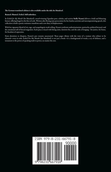 Banned. Hunted. Exiled. Still unbroken. In Exiled for My Mouth ( Im Mundexil), award-winning Ugandan poet, scholar, and activist Stella Nyanzi delivers a bold and blistering literary offering forged in the fires of exile. Written after fleeing state persecution for her fearless activism and uncompromising speech, this collection is both a poetic resistance manifesto and a raw diary of displacement. With her signature blend of wit, rage, and unapologetic truth-telling, Nyanzi confronts authoritarianism, patriarchy, political betrayal, and the emotional toll of forced migration. Each piece is laced with biting satire, feminist fire, and the ache of longing-for justice, for home, for freedom of expression. From detention to diaspora, Nyanzi's pen remains uncensored. These pages vibrate with the voice of a woman who refuses to be silenced-even in exile. EM* Mundexil* is not just a book-it's a battleground of words, a cry of defiance, and a testament to the power of speaking truth to power, no matter the cost. The German translated edition is also available under the title Im Mundexil.
