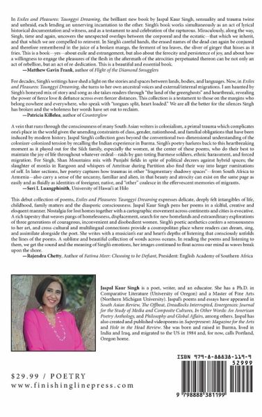 Exiles and Pleasures: Taunggyi Dreamer, reflecting themes of trauma, memory, psychic fragmentation and survival, echoes the poet's own multiple migrations as a member of the Sikh diaspora-from the mountains of the Shan States in Taunggyi, Burma, to the subtropical and semi-arid capital of India, New Delhi, to the hot deserts of Baghdad, Iraq, and eventually to the cold shores of Lake Superior in the Upper Peninsula of Michigan in the United States of America. The poetry, inspired by Singh's exile from her birth country, Burma, after the military coup of 1962, to her resettlement as a stateless citizen in her ancestral home in India during her teen years and eventually, her arrival in her thirties to the U.S. as a resident alien, is fueled and driven by ancestral female voices-grandmothers and mother-and especially by the poet's own hybrid ethos through woman-centric poetics. It is the community of women, in domestic and public spaces of the home and the world, in India/Burma and in the Indian diaspora, particularly the Sikh, that defines Singh's singularly creative style. She, too, like many diasporic writers, uses hybridity to create an aesthetic that, although not unique in terms of postcolonialism, is particularly hers in that, as a tricultural transplant, her writing vividly reveals the pluralistic ethos of an exile and a diasporic. Like George Lamming, Singh highlights not only about the trauma of dislocation, but also about the "pleasures of exile" through her splintered poetics.