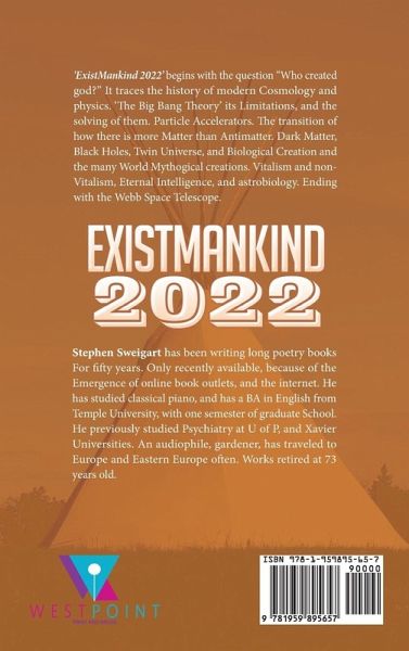 'ExistMankind 2022' begins with the question "Who created god?" It traces the history of modern Cosmology and physics. 'The Big Bang Theory its Limitations, and the solving of them. Particle Accelerators. The transition of how there is more Matter than Antimatter. Dark Matter, Black Holes, Twin Universe, and Biological Creation and the many World Mythogical creations. Vitalism and non- Vitalism, Eternal Intelligence, and Astrobiology. Ending with the Webb Space Telescope. Stephen Sweigart has been writing long poetry books For fifty years. Only recently available, because of the Emergence of online book outlets, and the internet. He has studied classical piano and has a BA in English from Temple University, with one semester of graduate school. He previously studied Psychiatry at U of P and Xavier Universities. An audiophile, and gardener, has traveled to Europe and Eastern Europe often. Works retired at 73 years old.