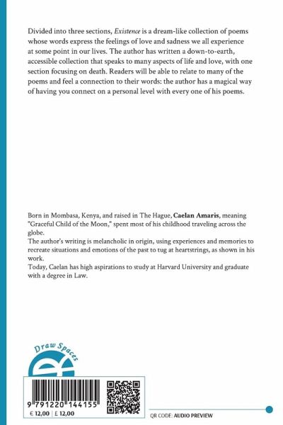 Divided into three sections, Existence is a dream-like collection of poems whose words express the feelings of love and sadness we all experience at some point in our lives. The author has written a down-to-earth, accessible collection that speaks to many aspects of life and love, with one section focusing on death. Readers will be able to relate to many of the poems and feel a connection to their words: the author has a magical way of having you connect on a personal level with every one of his poems. Born in Mombasa, Kenya, and raised in The Hague, Caelan Amaris, meaning "Graceful Child of the Moon," spent most of his childhood traveling across the globe. The author's writing is melancholic in origin, using experiences and memories to recreate situations and emotions of the past to tug at heartstrings, as shown in his work. Today, Caelan has high aspirations to study at Harvard University and graduate with a degree in Law.