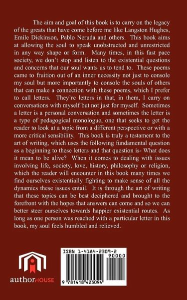 The aim and goal of this book is to carry on the legacy of the greats that have come before me like Langston Hughes, Emile Dickinson, Pablo Neruda and others. This book aims at allowing the soul to speak unobstructed and unrestricted in any way shape or form. Many times, in this fast pace society, we don't stop and listen to the existential questions and concerns that our soul wants us to tend to. These poems came to fruition out of an inner necessity not just to console my soul but more importantly to console the souls of others that can make a connection with these poems, which I prefer to call letters. They're letters in that, in them, I carry on conversations with myself but not just for myself. Sometimes a letter is a personal conversation and sometimes the letter is a type of pedagogical monologue, one that seeks to get the reader to look at a topic from a different perspective or with a more critical sensibility. This book is truly a testament to the art of writing, which uses the following fundamental question as a beginning to these letters and that question is- What does it mean to be alive? When it comes to dealing with issues involving life, society, love, history, philosophy or religion, which the reader will encounter in this book many times we find ourselves existentially fighting to make sense of all the dynamics these issues entail. It is through the art of writing that these topics can be best deciphered and brought to the forefront with the hopes that answers can come and so we can better steer ourselves towards happier existential routes. As long as one person was reached with a particular letter in this book, my soul feels humbled and relieved.