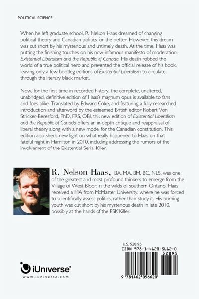 When he left graduate school, R. Nelson Haas dreamed of changing political theory and Canadian politics for the better. However, this dream was cut short by his mysterious and untimely death. At the time, Haas was putting the finishing touches on his now-infamous manifesto of moderation, Existential Liberalism and the Republic of Canada. His death robbed the world of a true political hero and prevented the official release of his book, leaving only a few bootleg editions of Existential Liberalism to circulate through the literary black market. Now, for the first time in recorded history, the complete, unaltered, unabridged, definitive edition of Haas's magnum opus is available to fans and foes alike. Translated by Edward Coke, and featuring a fully researched introduction and afterword by the esteemed British editor Robert Von Stricker-Beresford, PhD, FRS, OBI, this new edition of Existential Liberalism and the Republic of Canada offers an in-depth critique and reappraisal of liberal theory along with a new model for the Canadian constitution. This edition also sheds new light on what really happened to Haas on that fateful night in Hamilton in 2010, including addressing the rumors of the involvement of the Existential Serial Killer.