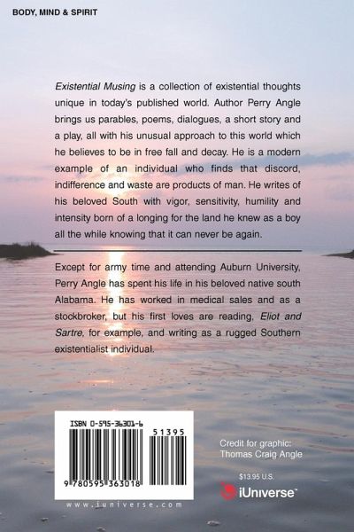 Existential Musing is a collection of existential thoughts unique in today's published world. Author Perry Angle brings us parables, poems, dialogues, a short story and a play, all with his unusual approach to this world which he believes to be in free fall and decay. He is a modern example of an individual who finds that discord, indifference and waste are products of man. He writes of his beloved South with vigor, sensitivity, humility and intensity born of a longing for the land he knew as a boy all the while knowing that it can never be again.