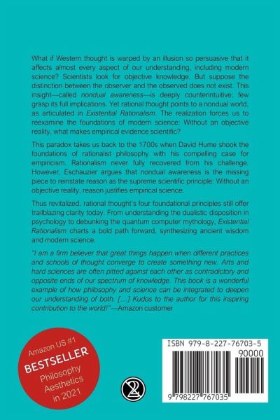 The original treatise introducing rational nondualism. What if Western thought is warped by an illusion so persuasive that it affects almost every aspect of our understanding, including modern science? Scientists look for objective knowledge. But suppose the distinction between the observer and the observed does not exist. This insight-called nondual recognition-is deeply counterintuitive; few grasp its full implications. Yet rational thought points to a nondual world, as articulated in Existential Rationalism. The realization forces us to reexamine the foundations of modern science: Without an objective reality, what makes empirical evidence scientific? This paradox takes us back to the 1700s when David Hume shook the foundations of rationalist philosophy with his compelling case for empiricism. Rationalism never fully recovered from his challenge. However, Eschauzier argues that nondual recognition is the missing piece to reinstate reason as the supreme scientific principle: Without an objective reality, reason justifies empirical science. Thus revitalized, rational thought's four foundational principles still offer trailblazing clarity today. From understanding the dualistic disposition in psychology to nuancing quantum mechanics interpretations, Existential Rationalism charts a bold path forward, synthesizing ancient wisdom and modern science. "I am a firm believer that great things happen when different practices and schools of thought converge to create something new. Arts and hard sciences are often pitted against each other as contradictory and opposite ends of our spectrum of knowledge. This book is a wonderful example of how philosophy and science can be integrated to deepen our understanding of both. [...] Kudos to the author for this inspiring contribution to the world!"-Amazon customer