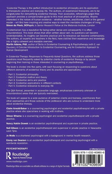 'Existential Therapy: Responses to Frequently Asked Questions is the perfect introduction to existential philosophy and its application to therapeutic practice and everyday life. The authors, all experienced therapists, are to be congratulated for demystifying existential therapy. Their accessible, refreshingly jargon-free approach provides a companionable guide to this most practical of philosophies. While the Q&A format gives the reader the freedom to dip in and out, or read from cover-to-cover, as they please, it does not detract from the overall quality of the text. Anyone interested in the nature of human existence - whether trainee, practitioner, client or the general reader - will find here inspiring and creative ways to meet the inevitable challenges of living.' Simon du Plock, DCPsych, Senior Research Fellow at the Metanoia Institute, London