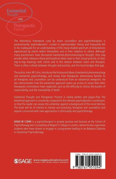 `A lucid and much-needed account of existential psychotherapy... As well as locating existential psychotherapy within a historical and philosophical context, Hans Cohn encompasses various therapeutic issues and provides some vivid and sensitive passages of case material... [which are] remarkable for their sensitivity and understanding... I found the book provided a concise and clarifying account of the underlying philosophy and of the psychotherapeutic practice... Hans W Cohn's comparison of an existential-phenomenological approach with psychoanalysis delineates areas of complementarity and areas of radical difference. The existentialist challenge to Freud outlined in the book provides an alternative point of view to counter potentially engulfing aspects of a psychoanalytic vision. This is a stimulating book which is a valuable contribution towards dialogue between different approaches of psychotherapy' - International Journal of Psychotherapy