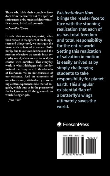 Existentialism Now brings the reader face to face with the stunning realization that each of us has total freedom and total responsibility for the entire world. Setting this realization of salvation in motion is easily arrived at by simply challenging students to take responsibility for planet Earth. This singular existential flap of a butterfly's wings ultimately saves the world.