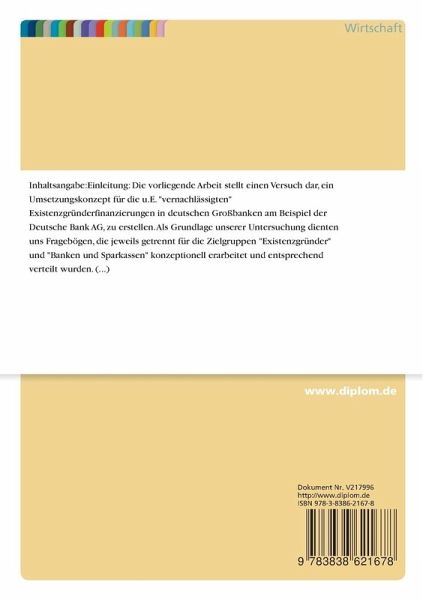 Inhaltsangabe:Einleitung: Die vorliegende Arbeit stellt einen Versuch dar, ein Umsetzungskonzept für die u.E. "vernachlässigten" Existenzgründerfinanzierungen in deutschen Großbanken am Beispiel der Deutsche Bank AG, zu erstellen. Als Grundlage unserer Untersuchung dienten uns Fragebögen, die jeweils getrennt für die Zielgruppen "Existenzgründer" und "Banken und Sparkassen" konzeptionell erarbeitet und entsprechend verteilt wurden. Die Reaktionen in den Gründerzentren und bei den befragten Zielgruppen waren überwiegend sehr positiv einzuschätzen. Insgesamt wurden 150 Gründer und 45 Berater der Banken und Sparkassen kontaktiert. Der Rücklauf von 60 Fragebögen bei den Existenzgründern ist mit 40 % zufriedenstellend, ebenso wie bei den Beratern der Banken und Sparkassen mit 23 Rückläufen von 45 ver-teilten Bögen. Dieser liegt im Rahmen des Rücklaufs anderer Studien mit der gleichen Zielgruppe und ist bei einem Fragebogenumfang von 4 Seiten bzw. 5 Seiten insgesamt als befriedigend anzusehen. Eine detaillierte Aufstellung der Adressaten der Fragebögen wurde aufgrund der anonymen Befragungsmethode bewußt nicht erstellt. Die Ergebnisse der schriftlichen Erhebung konnten durch ein persönliches Interview mit der Projektleiterin Sonderfinanzierungen (auch zuständig für Existenzgründungsfinanzierungen) der Dresdner Bank AG am 24.03.1999 in Frankfurt ergänzt werden. Um die vorherrschenden Stimmungen sowohl bei den potentiellen Existenzgründern als auch den finanzierenden Banken einzufangen, wurden von den Mitgliedern der Projektarbeitsgruppe zusätzlich besucht: - Existenzgründermesse START in Essen (Zeitraum 10.09.-13.09.1998). - Existenzgründertag des Handelsgremiums Amberg-Sulzbach (Aussenstelle der IHK Regensburg) in Zusammenarbeit mit der Fachhochschule Amberg-Weiden in Amberg am 25.09.1998. - Gründerkongress 98 in München / Unternehmer sein macht Spaß (Schirmherrschaft Dr. Roman Herzog) am 27.10.1998. - Existenzgründermesse START in Nürnberg (Zeitraum 25.02. - 28.02.1999). - Innovations- und Gründerzentren Straubing-Sand am 02.11.1998. - Münchener Existenzgründerbüro am 10.11.1998. - Existenzgründerzentrum Ingolstadt, Geschäftsführer Norbert Forster am 27.03.1999. - IHK Würzburg-Schweinfurt - Existenzgründerberatung - am 04.11.1998. - IHK Heilbronn - Aussenstelle Bad Mergentheim - am 17.11.1998. - IHK Regensburg - Aussenstelle Weiden - am [¿]
