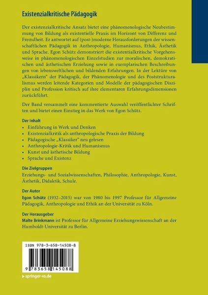 Der existenzialkritische Ansatz als Phänomenologie der Besinnung antwortet auf (post-)moderne Herausforderungen der wissenschaftlichen Pädagogik in Anthropologie, Ethik, Ästhetik, Sprache und Humanismus. Er führt zur Neubestimmung von Bildung als existentielle Praxis im Horizont von koexistenziellen Erfahrungs- und Praxisdimensionen. Diese werden in phänomenologischen Einzelstudien zur moralischen, demokratischen und ästhetischen Erziehung aufgewiesen. Egon Schütz demonstriert die existentialkritische Vorgehensweise in exemplarischen Beschreibungen von lebensweltlichen und bildenden Erfahrungen sowie in der Lektüre von "Klassikern" der Pädagogik, der Phänomenologie und des Poststrukturalismus. Zirkularität, Differenz, Fremdheit, Resonanz und Existenz sind Phänomene, mit denen leitende Kategorien und Modelle der pädagogischen Disziplin und Profession kritisch auf ihre elementaren Erfahrungsdimensionen zurückführt werden.