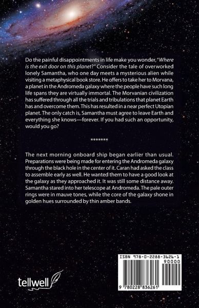 Do the painful disappointments in life make you wonder "Where is the exit door on this planet? Consider the tale of over worked, lonely Samantha who one day meets a mysterious Alien while visiting a metaphysical book store. He offers to take her to Morvana, a planet in the Andromeda galaxy where the people have such long life spans they are virtually immortal. The Morvanian civilization has suffered through all the trials and tribulations that planet Earth has and overcome them. This has resulted in a near perfect Utopian planet. The only catch is, Samantha must agree to leave Earth and everything she knows -- forever. If you had such an opportunity, would you go?