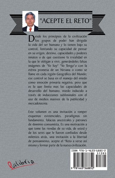 "Acepte el Reto" Desde los principios de la civilización los grupos de poder han dirigido la vida del ser humano y lo tienen bajo su control, limitando su capacidad de pensar en su origen, destino, capacidades y poderes innatos o de que cuestione la irrealidad en la que le obligan a vivir, generándoles falsas imágenes de "Yo Soy" "Yo Tengo"o con la etérea promesa de un Nirvana o como se llame en cada región Geográfica del Mundo; ese control se basa en el manejo del miedo como emoción primaria negativa, pero que es la que limita mas las capacidades de desarrollo del humano, miedo inducido a través de inducciones subliminales con el uso de medios masivos de la publicidad y mercadotecnia. Este volumen es una invitación a romper esquemas existenciales, paradigmas sin fundamento, falacias ancestrales y patrones de dominio consumista, Es una motivación a que tome las riendas de su vida, de usted y de los seres que le fueron confiados desde milenios atrás, una invitación a la libertad de pensamiento, acepte el "Reto a verse así mismo y formar parte de la nueva civilización.