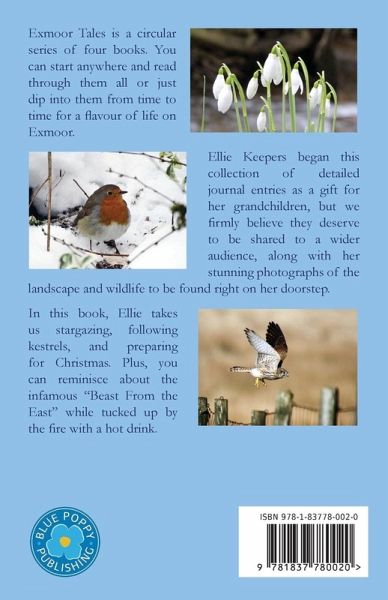 Exmoor Tales is a circular series of four books. You can start anywhere and read through them all or just dip into them from time to time for a flavour of life on Exmoor. Ellie Keepers began this collection of detailed journal entries as a gift for her grandchildren, but we firmly believe they deserve to be shared to a wider audience, along with her stunning photographs of the landscape and wildlife to be found right on her doorstep. In this book, Ellie takes us stargazing, following kestrels, and preparing for Christmas. Plus, you can reminisce about the infamous "Beast From the East" while tucked up by the fire with a hot drink.