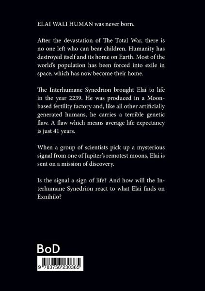 ELAI WALI HUMAN was never born. After the devastation of The Total War, there is no one left who can bear children. Humanity has destroyed itself and its home on Earth. Most of the world's population has been forced into exile in space, which has now become their home.The Interhumane Synedrion brought Elai to life in the year 2239. He was produced in a Moon-based fertility factory and, like all other artificially generated humans, he carries a terrible genetic flaw. A flaw which means average life expectancy is just 41 years.When a group of scientists pick up a mysterious signal from one of Jupiter's remotest moons, Elai is sent on a mission of discovery. Is the signal a sign of life? And how will the Interhumane Synedrion react to what Elai finds on Exnihilo?