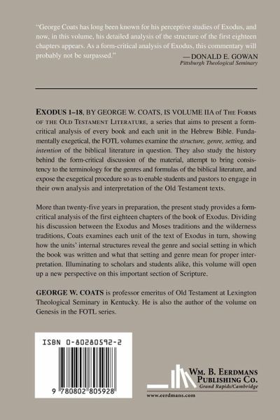 Exodus 1-18, by George W. Coats, is Volume IIA of THE FORMS OF THE OLD TESTAMENT LITERATURE, a series that aims to present a form-critical analysis of every book and each unit in the Hebrew Bible. Fundamentally exegetical,the FOTL volumes examine the structure, genre, setting, and intention of the biblical literature in question.They also study the history behind the form-critical discussion of the material, attempt to bring consistency tothe terminology for the genres and formulas of the biblical literature, and expose the exegetical process soas to enable students and pastors to engage in their own analysis and interpretation of the Old Testament texts. More than twenty-five years in preparation, this present study provides a form-critical analysis of the first eighteen chapters of the book of Exodus. Dividing his discussion between the Exodus and Moses traditions and the wilderness traditions, Coats examines each unit of the text of Exodus in turn, showing how the units' internal structures reveal the genre and social setting in which the book was written and what that setting and genre mean for proper interpretation. Illuminating to scholars and students alike, this volume will open up a new perspective on this important section of Scripture.