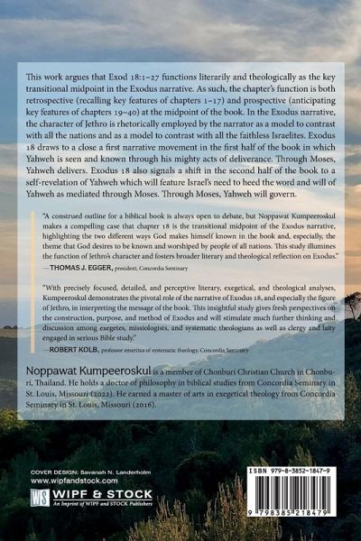 This work argues that Exod 18:1-27 functions literarily and theologically as the key transitional midpoint in the Exodus narrative. As such, the chapter's function is both retrospective (recalling key features of chapters 1-17) and prospective (anticipating key features of chapters 19-40) at the midpoint of the book. In the Exodus narrative, the character of Jethro is rhetorically employed by the narrator as a model to contrast with all the nations and as a model to contrast with all the faithless Israelites. Exodus 18 draws to a close a first narrative movement in the first half of the book in which Yahweh is seen and known through his mighty acts of deliverance. Through Moses, Yahweh delivers. Exodus 18 also signals a shift in the second half of the book to a self-revelation of Yahweh which will feature Israel's need to heed the word and will of Yahweh as mediated through Moses. Through Moses, Yahweh will govern.