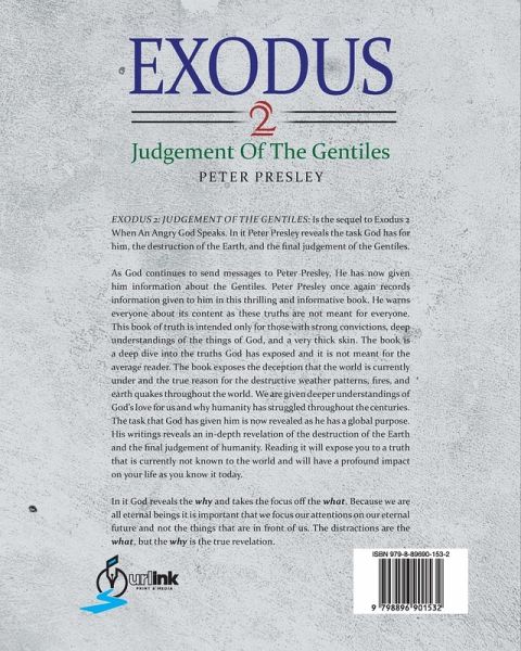 EXODUS 2: JUDGEMENT OF THE GENTILES: Is the sequel to Exodus 2 When An Angry God Speaks. In it Peter Presley reveals the task God has for him, the destruction of the Earth, and the final judgement of the Gentiles. As God continues to send messages to Peter Presley, He has now given him information about the Gentiles. Peter Presley once again records information given to him in this thrilling and informative book. He warns everyone about its content as these truths are not meant for everyone. This book of truth is intended only for those with strong convictions, deep understandings of the things of God, and a very thick skin. The book is a deep dive into the truths God has exposed and it is not meant for the average reader. The book exposes the deception that the world is currently under and the true reason for the destructive weather patterns, fires, and earth quakes throughout the world. We are given deeper understandings of God's love for us and why humanity has struggled throughout the centuries. The task that God has given him is now revealed as he has a global purpose. His writings reveals an in-depth revelation of the destruction of the Earth and the final judgement of humanity. Reading it will expose you to a truth that is currently not known to the world and will have a profound impact on your life as you know it today. In it God reveals the why and takes the focus off the what. Because we are all eternal beings it is important that we focus our attentions on our eternal future and not the things that are in front of us. The distractions are the what, but the why is the true revelation.