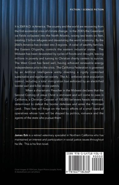 In 2069 A.D. a divided nation and the world are recovering from a devastating climate change event. A cabal of wealthy families controls the Eastern industrial states. The Midwest has been ravaged by cycles of flood and drought, leaving many to rely on Christian charities. The California Federation of coastal states has fared well under governance by an artificial intelligence that has walled off the state behind a deadly high voltage barrier and killer drones. When a charismatic preacher declares the imminent second coming of Christ will occur in California, a caravan of 100,000 desperate Christians is determined to defeat the border wall and enter their promised land. Their fate hangs on the actions of a small band of young operatives whose lives will be shaped by politics, romance and the operatives of the state who pursue them.