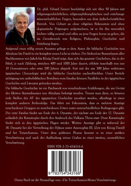 Aufgrund eines völlig neuen Ansatzes gelingt es dem Autor die biblische Geschichte von Abraham bis David in ein komplett neues Licht zu rücken. Der lückenlose Stammbaum aller Nachkommen von Jakob bis König David zeigt, dass sich das gesamte Geschehen, das in der Bibel, je nach Zählung, zwischen 400 und 1000 Jahre dauert, effektiv innerhalb von nur 10 Generationen oder etwa 200 Jahren abspielt. Erst mit der um 300 Jahre verkürzten ägyptischen Chronologie wird die biblische Geschichte nachvollziehbar. Unter Berücksichtigung von außerbiblischen Berichten vom Exodus können Parallelen in der ägyptischen Geschichte und Literatur gefunden werden.Die biblische Geschichte ist ein Patchwork von verschiedenen Erzählungen, die am Gerüst des fiktiven Stammbaumes von Abraham befestigt wurden. Trennt man diese, so können viele Stellen des AT der ägyptischen Geschichte zuordnet werden, allerdings in einer komplett anderen Reihenfolge. Das führt zur Erkenntnis, dass es mehrere Auszüge verschiedener Gruppen zu verschiedenen Zeiten unter unterschiedlichen Bedingungen gibt. Der erste Exodus findet am Ende der 6. Dynastie, der nächste am Ende der 12. Dynastie anlässlich der Katastrophe durch den Ausbruch des Vulkans Thera statt. Diese Katastrophe findet sich in den ägyptischen Plagen wieder. Weitere Auszüge gibt es während der 18. Dynastie bei der Vertreibung der Hyksos unter Amenophis III. (Zeit von König David) und bei Tutanchamun. Unter dem goldenen Pharao kommt es zu einer antiken Verschwörung und nach der Auffindung seines Grabes zu einer zweiten, neuzeitlichen Verschwörung.