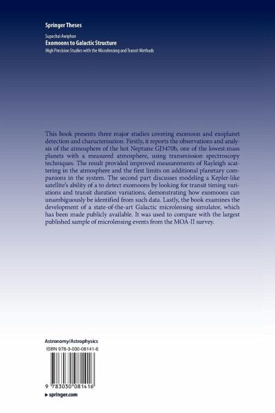 This book presents three major studies covering exomoon and exoplanet detection and characterisation. Firstly, it reports the observations and analysis of the atmosphere of the hot Neptune GJ3470b, one of the lowest-mass planets with a measured atmosphere, using transmission spectroscopy techniques. The result provided improved measurements of Rayleigh scattering in the atmosphere and the first limits on additional planetary companions in the system. The second part discusses modeling a Kepler-like satellite's ability of a to detect exomoons by looking for transit timing variations and transit duration variations, demonstrating how exomoons can unambiguously be identified from such data.Lastly, the book examines the development of a state-of-the-art Galactic microlensing simulator, which has been made publicly available. It was used to compare with the largest published sample of microlensing events from the MOA-II survey.