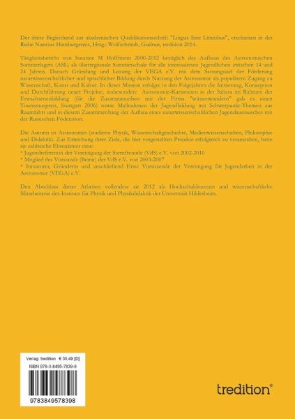 Tätigkeitsbericht von Susanne M Hoffmann 2000-2012 bezüglich des Aufbaus des Astronomischen Sommerlagers (ASL) als überregionale Sommerschule für alle interessierten Jugendlichen zwischen 14 und 24 Jahren. Danach Gründung und Leitung der VEGA e.V. mit dem Satzungsziel der Förderung naturwissenschaftlicher und sprachlicher Bildung durch Nutzung der Astronomie als populärem Zugang zu Wissenschaft, Kunst und Kultur. In dieser Mission erfolgte in den Folgejahren die Initiierung, Konzeption und Durchführung neuer Projekte, insbesondere Astronomie-Karawanen in der Sahara im Rahmen der Erwachsenenbildung (für die Zusammenarbeit mit der Firma "wüstenwandern" gab es einen Tourismuspreis, Stuttgart 2006) sowie Maßnahmen der Jugendbildung mit Schwerpunkt-Themen zur Raumfahrt und in diesem Zusammenhang der Aufbau eines naturwissenschaftlichen Jugendaustausches mit der Russischen Föderation.