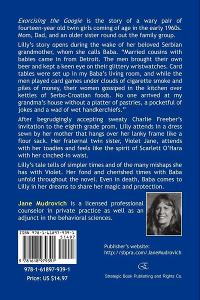 Exorcising the Googie is the story of a wary pair of fourteen-year-old twin girls coming of age in the early 1960s. Mom, Dad, and an older sister round out the family group. Lilly's story opens during the wake of her beloved Serbian grandmother, whom she calls Baba. "Married cousins with babies came in from Detroit. The men brought their own beer and kept a keen eye on their glittery wristwatches. Card tables were set up in my Baba's living room, and while the men played card games under clouds of cigarette smoke and piles of money, their women gossiped in the kitchen over kettles of Serbo-Croatian foods. No one arrived at my grandma's house without a platter of pastries, a pocketful of jokes and a wad of wet handkerchiefs." After begrudgingly accepting sweaty Charlie Freeber's invitation to the eighth grade prom, Lilly attends in a dress sewn by her mother that hangs over her lanky frame like a flour sack. Her fraternal twin sister, Violet Jane, attends with her toadies and feels like the spirit of Scarlett O'Hara with her cinched-in waist. Lilly's tale tells of simpler times and of the many mishaps she has with Violet. Her fond and cherished times with Baba unfold throughout the novel. Even in death, Baba comes to Lilly in her dreams to share her magic and protection. Jane Mudrovich is a licensed professional counselor in private practice as well as an adjunct in the behavioral sciences.