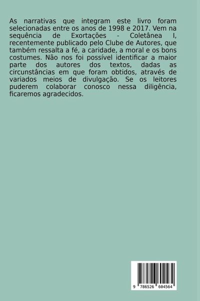 As narrativas que integram este livro foram selecionadas entre os anos de 1998 e 2017. Vem na sequência de Exortações - Coletânea I, recentemente publ