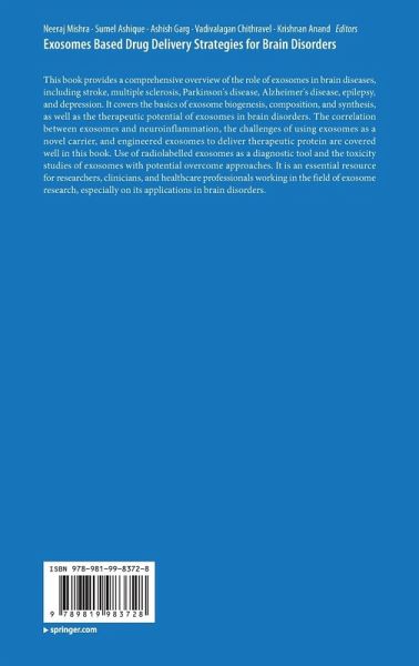Chapter 1_ Introduction to Exosome and its role in Brain disorders.- Chapter 2_ Exosomes: Biogenesis, Composition and Synthesis.- Chapter 3_ Therapeutic Impact of Exosomes in Stroke and Transient Ischemic Attack (TIA).- Chapter 4_ Role of exosomes in Multiple Sclerosis.- Chapter 5_ Therapeutic impact of exosomes Stroke and Transient Ischemic Attack (TIA).- Chapter 6_ Role of exosomes in Parkinson's and Alzheimer's diseases.- Chapter 7_ Role of exosomes in Epilepsy and other Seizure Disorders.- Chapter 8_ Role of exosomes in management of depression.- Chapter 9_ Role of Microbiota-Derived Exosomes in Gut-Brain Communication for the treatment of brain disorders.- Chapter 10_ Advancement of Engineered Exosomes to deliver therapeutic protein cargos in brain disorders.- Chapter 11_ Correlation between exosomes and neuro inflammation in various brain disorders.- Chapter 12_ Recent challenges of exosomes as novel carrier in various brain disorders.- Chapter 13_Advancement of radiolabeled exosomes in brain disorders.- Chapter 14_ Exosomes as future diagnostic tool for brain disorders.- Chapter 15_ Toxicity studies of exosomes and the potential overcome approaches.