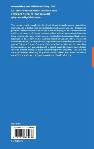 This volume provides insight into the pivotal roles of stem cells, exosomes and other microvesicles in biofunction and molecular mechanisms and their therapeutic potential in translational nanomedicine. It further highlights evidence from recent studies as to how stem cell derived exosomes and microRNAs may restore and maintain tissue homeostasis, enable cells to recover critical cellular functions and begin repair regeneration. These early studies in animal models of aging also show evidence of improved immune, cardiovascular and cognitive functions as well as improved health span and life span. The use of exosomes from body fluids to define specific biomarkers for various tumors may also clear the path to patient-targeted treatments by developing exosome-derived microRNA based cancer therapeutics. It is essential reading for graduate students, research fellow and biomedical researchers in academia or the pharmaceutical or biotech industries.
