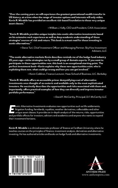 This book evaluates new opportunities such as life settlements, litigation funding, farmlands, royalties, weather derivatives, collectables and other unique asset classes. It provides an in-depth analysis of the returns, risks, opportunities and portfolio effects for investors, advisors and academics and anyone who wants to expand their investment horizons.