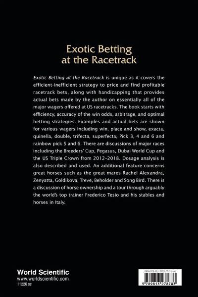 Exotic Betting at the Racetrack is unique as it covers the efficient-inefficient strategy to price and find profitable racetrack bets, along with handicapping that provides actual bets made by the author on essentially all of the major wagers offered at US racetracks. The book starts with efficiency, accuracy of the win odds, arbitrage, and optimal betting strategies. Examples and actual bets are shown for various wagers including win, place and show, exacta, quinella, double, trifecta, superfecta, Pick 3, 4 and 6 and rainbow pick 5 and 6. There are discussions of major races including the Breeders' Cup, Pegasus, Dubai World Cup and the US Triple Crown from 2012–2018. Dosage analysis is also described and used. An additional feature concerns great horses such as the great mares Rachel Alexandra, Zenyatta, Goldikova, Treve, Beholder and Song Bird. There is a discussion of horse ownership and a tour through arguably the world's top trainer Frederico Tesio and his stables and horses in Italy.