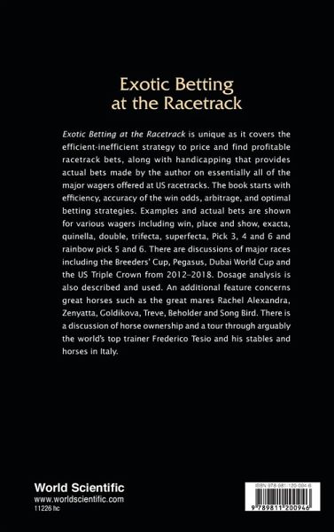 Exotic Betting at the Racetrack is unique as it covers the efficient-inefficient strategy to price and find profitable racetrack bets, along with handicapping that provides actual bets made by the author on essentially all of the major wagers offered at US racetracks. The book starts with efficiency, accuracy of the win odds, arbitrage, and optimal betting strategies. Examples and actual bets are shown for various wagers including win, place and show, exacta, quinella, double, trifecta, superfecta, Pick 3, 4 and 6 and rainbow pick 5 and 6. There are discussions of major races including the Breeders' Cup, Pegasus, Dubai World Cup and the US Triple Crown from 2012–2018. Dosage analysis is also described and used. An additional feature concerns great horses such as the great mares Rachel Alexandra, Zenyatta, Goldikova, Treve, Beholder and Song Bird. There is a discussion of horse ownership and a tour through arguably the world's top trainer Frederico Tesio and his stables and horses in Italy.