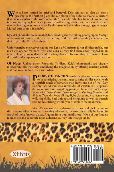 With a heart chained to grief and betrayal, Kyle sets out to plan an exotic getaway to the farthest place she can think of in order to escape. This venture entails a safari to the wilds of South Africa. She talks her friend Gina Austin into accompanying her on a sojourn that will change their lives forever as they meet two fascinating men, one a suave Englishman and the other a rugged game ranger. Mutual attraction is inevitable. Unfortunately, their trip into the Dark Continent is not all joy, but is an eye-opener for both Kyle and Gina as they find themselves trapped in an untenable situation of deceit and treachery that involves murder, harrowing adventures in the bush and a tapestry of coercion. Since photographs are interwoven into the text, giving you privy to the majestic animals, the settings and the thrills that take place, you'll feel as if you are, indeed, on safari with Kyle and Gina.