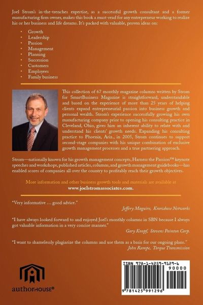A collection of 65 of Joel Strom's monthly columns for growing businesses on leadership, business growth, passion, management, planning, succession, customers, employees and family business. A must read for anyone growing a business.These columns provide sound, proven, realistic, and implementable advice for successfully growing your business and your personal wealth. They are straightforward and understandable and are based on the experience of more than 25 years of helping clients expand entrepreneurial passion into business growth and personal wealth.