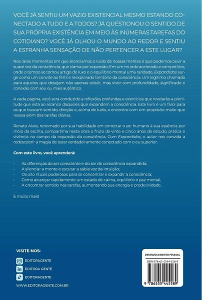 Descubra como despertar dentro de si um novo ser humano com plena consciência de seu propósito de vida! Você está pronto para a expansão? Nos raros momentos em que silenciamos o ruído interno de nossas mentes é que podemos ouvir a suave voz de nossa consciência, que clama por expansão. Em um mundo acelerado e competitivo, onde o tempo se tornou artigo de luxo e o equilíbrio mental uma raridade, Expandidos surge como um convite ao fértil e inexplorado território da consciência. Um legítimo chamado para aqueles que desejam não apenas existir, mas viver com profundidade, significado e conexão com seu eu superior. A cada página, você será conduzido a reflexões profundas e exercícios práticos que revelarão a plenitude que está ao alcance daqueles que expandem a consciência. Expandidos é um farol para os que buscam sentido, direção e, acima de tudo, o encontro com um propósito maior que ressoa além das tarefas diárias. Renato Alves, autor best-seller e reconhecido por sua habilidade em conectar o ser humano à sua essência por meio da escrita, compartilha nesta obra o fruto de 25 anos de estudo, prática e vivência no campo da expansão da consciência. Com Expandidos, o autor nos convida a redescobrir a magia de estar verdadeiramente conectado com o eu superior. Com este livro, você aprenderá: As diferenças do ser consciente e do ser de consciência expandida; Como silenciar a mente e escutar a sábia voz da intuição; Os 8 rituais poderosos para se concentrar e expandir a consciência; Como alcançar rapidamente um estado de calma, equilíbrio e paz mental; Como encontrar sentido nas tarefas, aumentar sua energia e produtividade. Ao expandir a consciência, você será capaz de experimentar um fluxo contínuo de prosperidade e abundância, revelando assim a chave para a verdadeira riqueza interior.