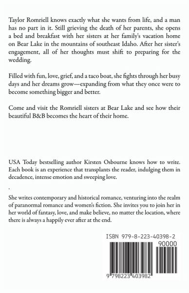 Taylor Romriell knows exactly what she wants from life, and a man has no part in it. Still grieving the death of her parents, she opens a bed and breakfast with her sisters at her family's vacation home on Bear Lake in the mountains of southeast Idaho. After her sister's engagement, all of her thoughts must shift to preparing for the wedding. Filled with fun, love, grief, and a taco boat, she fights through her busy days and her dreams grow—expanding from what they once were to become something bigger and better. Come and visit the Romriell sisters at Bear Lake and see how their beautiful B&B becomes the heart of their home.