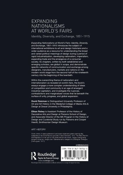 Expanding Nationalisms at World's Fairs: Identity, Diversity, and Exchange, 1851-1915 introduces the subject of international exhibitions to art and design historians and a wider audience as a resource for understanding the broad and varied political meanings of design during a period of rapid industrialization, developing nationalism, imperialism, expanding trade and the emergence of a consumer society. Its chapters, written by both established and emerging scholars, are global in scope, and demonstrate specific networks of communication and exchange among designers, manufacturers, markets and nations on the modern world stage from the second half of the nineteenth century into the beginning of the twentieth.